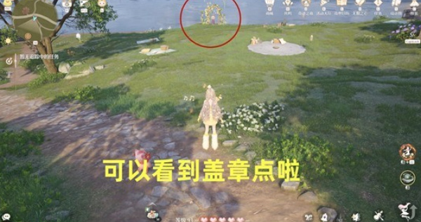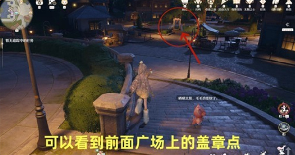 傳送到【愿望夢(mèng)境倉(cāng)庫(kù)旋廊】錨點(diǎn),向右邊的廣場(chǎng)走并調(diào)整視角,就能找到蓋章位置。
