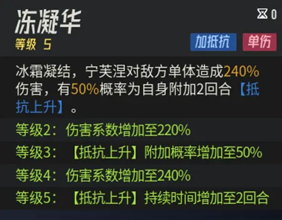 對敵方造成240%的單體傷害,并且有50%的概率為自身附加2回合抵抗上升,