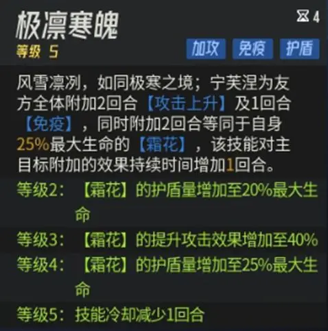 為全體隊友附加兩回合攻擊上升,1回合免疫,同時附加兩回合自身生命25%的護盾效果,對于主目標效果額外提升1回合。