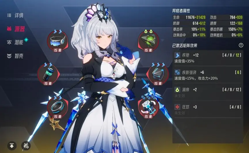 寧芙涅需要高速才可以先手給隊友加盾加免疫等效果,來提高隊友的輸出,因此只要是加速度加生命的矩陣都可以帶,比如疾馳+戍衛(wèi)+疾影強襲等。